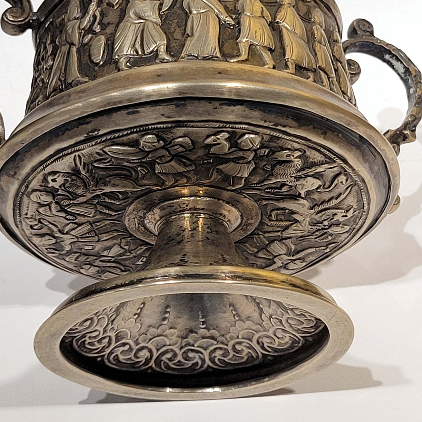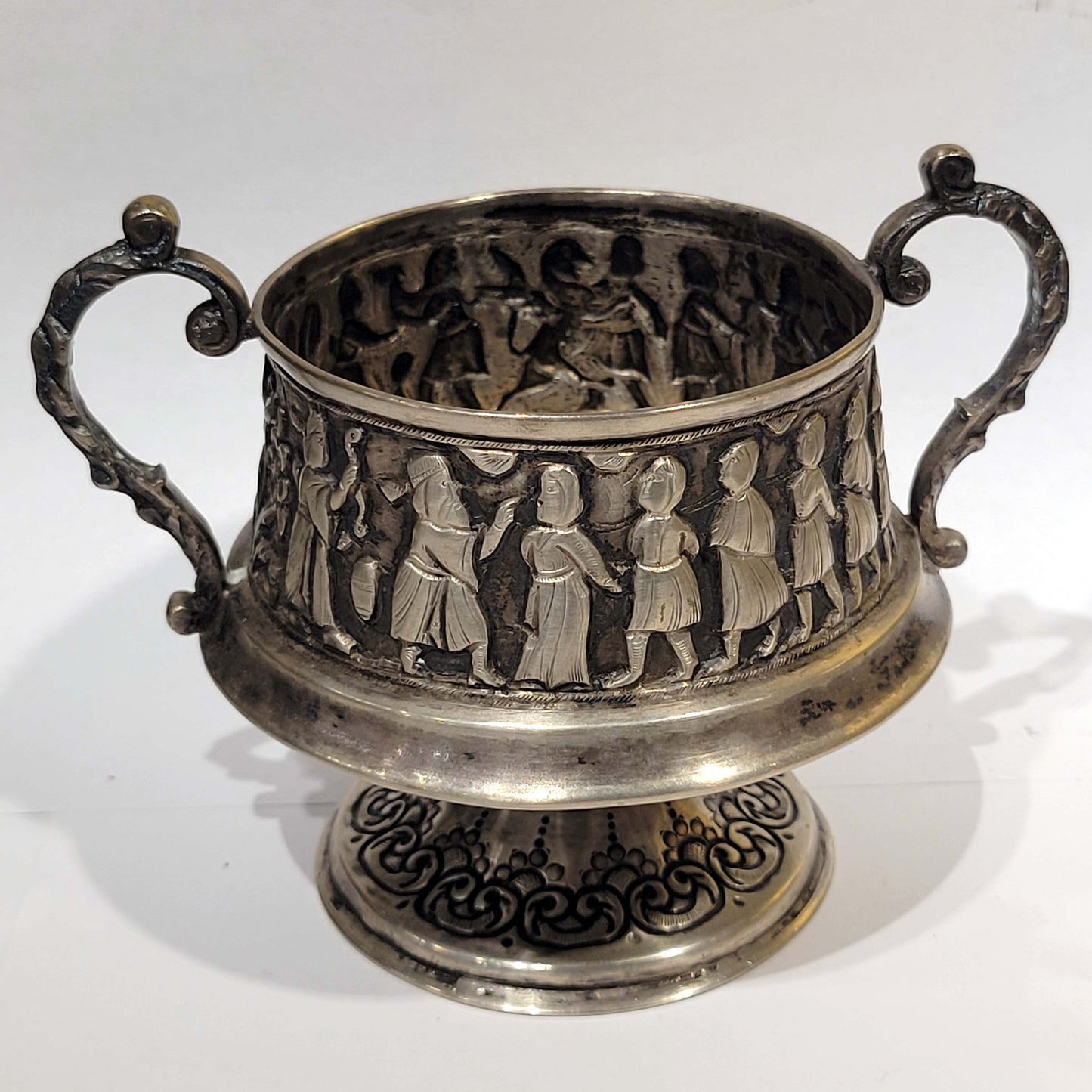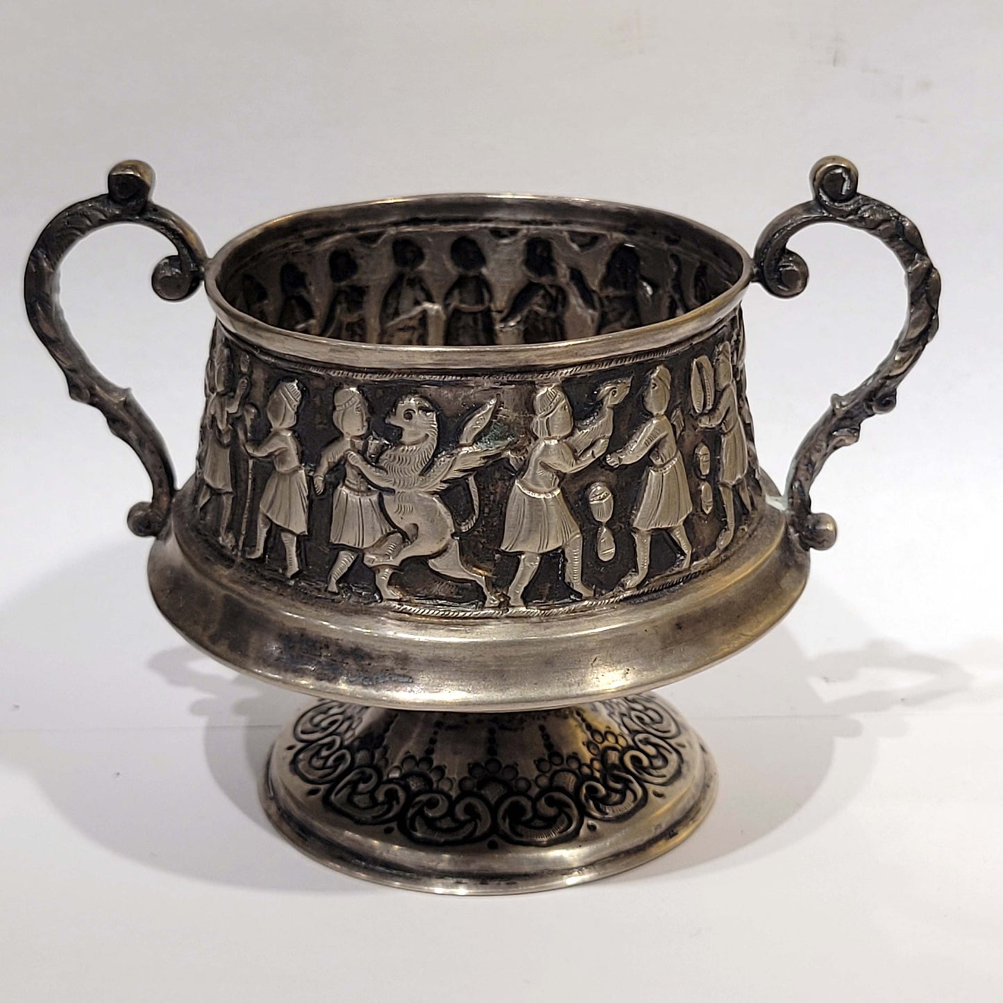 Antique Persian 84 Silver Repousse Sugar Bowl. Hand engraved all aroungd with raised relief . 11cm high, 14.5 cm from handle to handle. 255 grams.