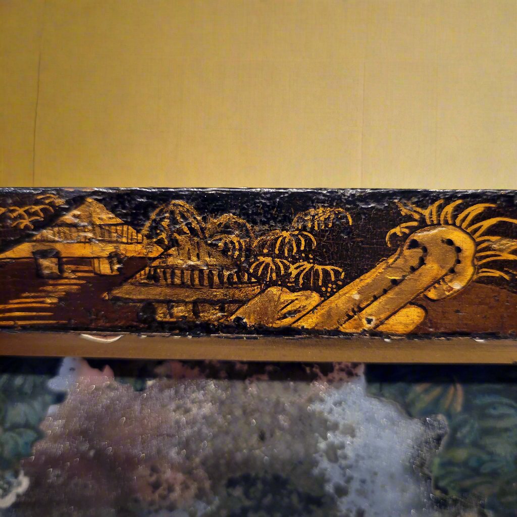 One painted with a lady seated holding a opium pipe, the other painted with a scholar playing a lute, with a lady seated beside him playing percussion instruments, with matching black lacquered and gilt-decorated wood frame.